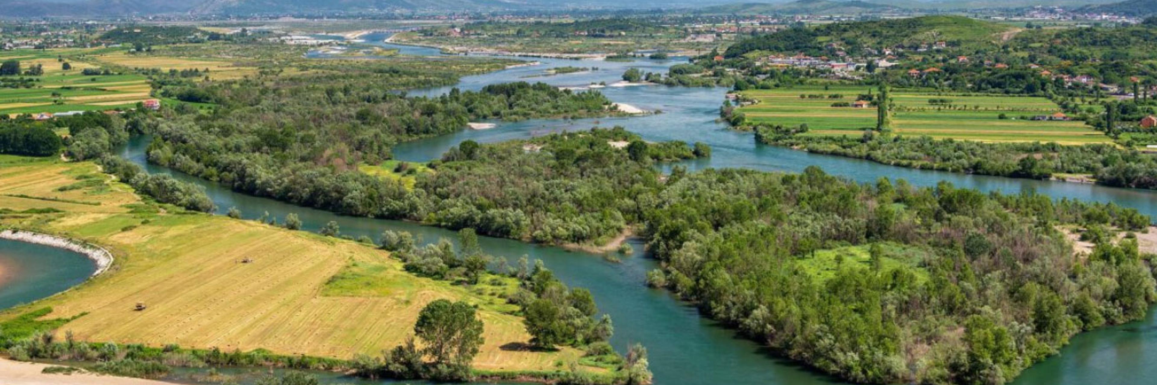 The Buna/Bojana river surges from the Shkodra/Skadar lake and flows to the Adriatic Sea, initially through Albanian territory, and subsequently forming the border between Albania and Montenegro. The total length of the river is 41 km. Along its meandering flow into fields and marshlands, the Buna river receives its most important tributary, Drin, the longest river in Albania (280 km), with a catchment area extending to the 6 Western Balkan countries (and inhabited from up to 1,6 million people). The Drin river contains the largest hydroelectric power station group in the Balkans regarding the installed and reservoir capacity, therefore heavily influencing the Buna sub-basin, where it flows.